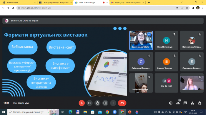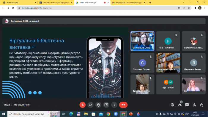Семінар-практикум шкільних бібліотекарів «Віртуальна книжкова виставка – багатокомпонентна форма популяризації інформаційних ресурсів шкільної бібліотеки» (9 фото) Дата публікації: 2022-11-03