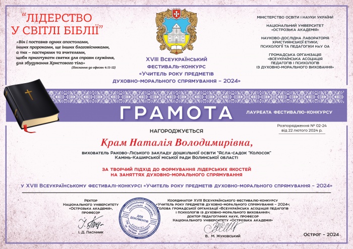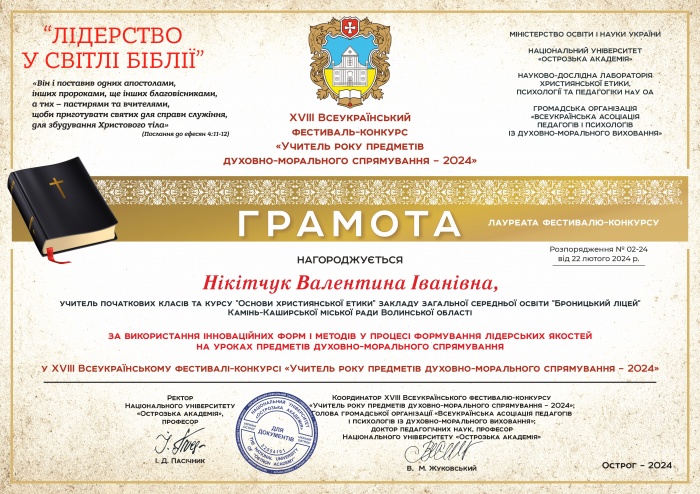 Всеукраїнський фестиваль-конкурс «УЧИТЕЛЬ РОКУ ПРЕДМЕТІВ ДУХОВНО-МОРАЛЬНОГО СПРЯМУВАННЯ – 2024» (3 фото) Дата публікації: 2024-03-01