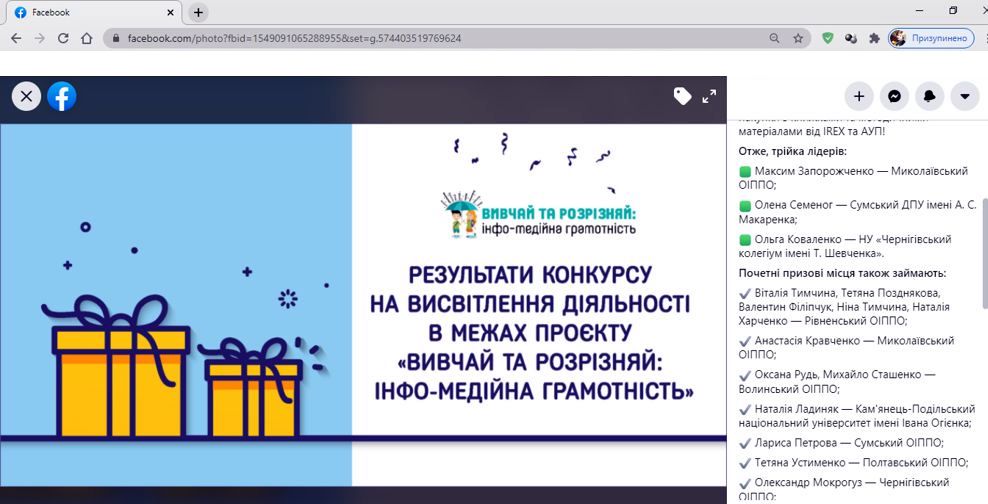 23.02.2021 року Оксана Рудь детально представила участь ВІППО у Проєкті «Вивчай та розрізняй: інфо-медійна грамотність» у форматі онлайн доповіді «Розробка та впровадження методики інтеграції інфомедійної грамотності в навчальні програми».