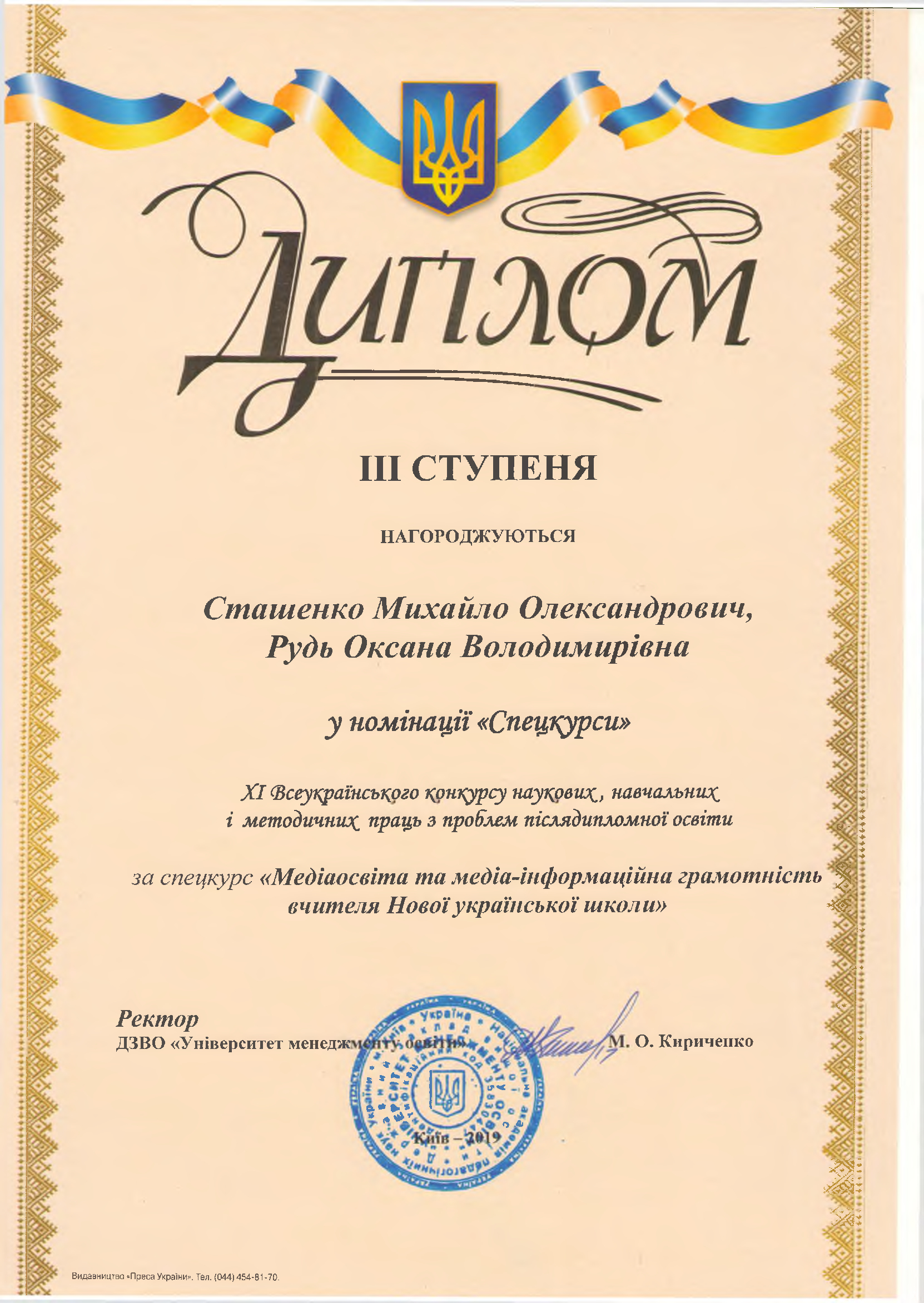 Укладені науково-педагогічними працівниками кафедри менеджменту освіти завідувачем кафедри, кандидатом фізико-математичних наук, доцентом Михайлом Сташенком та старшим викладачем Оксаною Рудь освітня програма підвищення кваліфікації педагогічних працівників на тематичних курсах «Медіаосвіта та медіаінформаційна грамотність вчителя нової української школи» на 2021-2023 роки і навчально-методичний комплекс для її фахової реалізації, та освітня програма навчального тренінгу «Медіаосвіта та медіаінформаційна грамотність в інноваційному освітньому менеджменті» на 2021-2023 роки пройшли успішну сертифікацію експертами Проєкту (отримано Сертифікат — фото).
