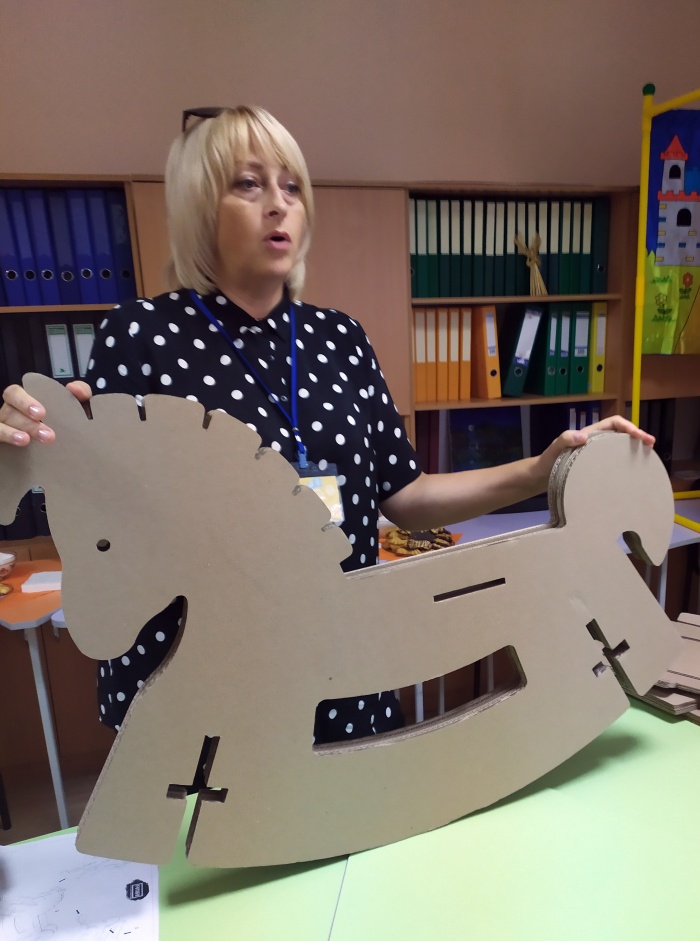 Кейс № 3 - «Коник - каталка» полягає у формуванні навичок у фахівців ІРЦ складати з екологічного матеріалу - картону багатофункціональні іграшки, розмальовувати їх у різні кольори, наносити елементи декору разом з дітьми. Такі вправи розвивають у дітей задатки до живопису, конструювання. Також коники - каталки діти зможуть використовувати в ігрових кімнатах.