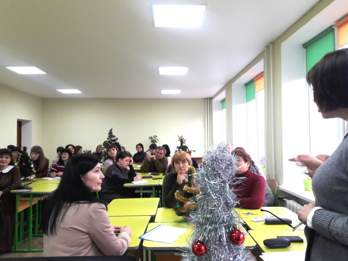Директор освітнього закладу, учитель-методист, автор ініціативи Сахарчук О. Я. повідомила присутнім про актуальність проблеми ДЕР в Новій українській школі, розповіла про певні позитивні здобутки педагогів із STEM-освіти в роботі навчального закладу.