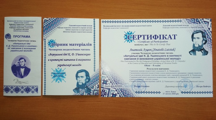 Кафедрою педагогіки і психології ВІППО та кафедрою педагогіки, психології та окремих методик Луцького педагогічного коледжу 27 лютого 2020 року було проведено Четверті педагогічні читання «Актуальні ідеї К. Д. Ушинського в контексті навчання й виховання української молоді».