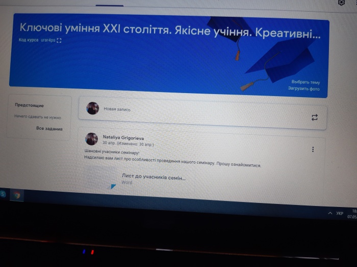 Протягом трьох днів, з 4 по 6 травня 2020 р., у режимі онлайн відбувся семінар-тренінг «Ключові уміння ХХІ століття. Якісне учіння. Креативність і уява», слухачами та активними учасниками якого були вчителі природничих дисциплін Рожищенського району (34 педагоги). На початку учасників привітала В. В. Вітюк, заступник директора з науково-методичної роботи Волинського ІППО, кандидат педагогічних наук, доцент, та побажала цікавого і успішного навчання.