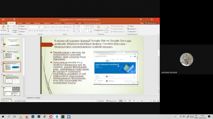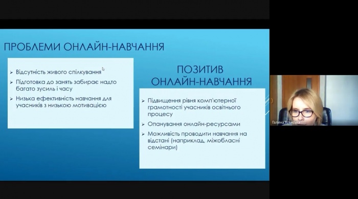 У ході заходу презентовано досвід використання «Google Classroom» як інструменту створення онлайн-середовища та налагодження взаємодії слухачів (Поліщук Н. А., завідувач лабораторії освітніх інновацій та координації діяльності РМК (ММК), Ягенська Г. В., доцент кафедри теорії та методики викладання шкільних предметів, кандидат педагогічних наук) Обговорено можливості використання YouTube, Zoom, платформи bbb2 (Остапйовськи О. І., доцент кафедри педагогіки та психології, кандидат педагогічних наук. Гребенюк А. В., старший лаборант кафедри педагогіки та психології, кандидат філософських наук, Кінах Н. В., доцент кафедри педагогіки та психології, кандидат економічних наук).