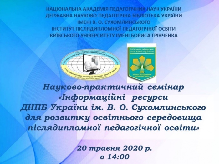 20 травня 2020 р. завідувач бібліотеки Волинського інституту післядипломної освіти Сміховська В. Є. взяла участь у науково-практичному онлайн-семінарі «Інформаційні ресурси ДНПБ України ім. В. О. Сухомлинського для розвитку освітнього середовища післядипломної педагогічної освіти», організаторами якого були Державна науково-педагогічна бібліотека України імені В. О. Сухомлинського НАПН України та Інститут післядипломної педагогічної освіти Київського університету імені Бориса Грінченка.