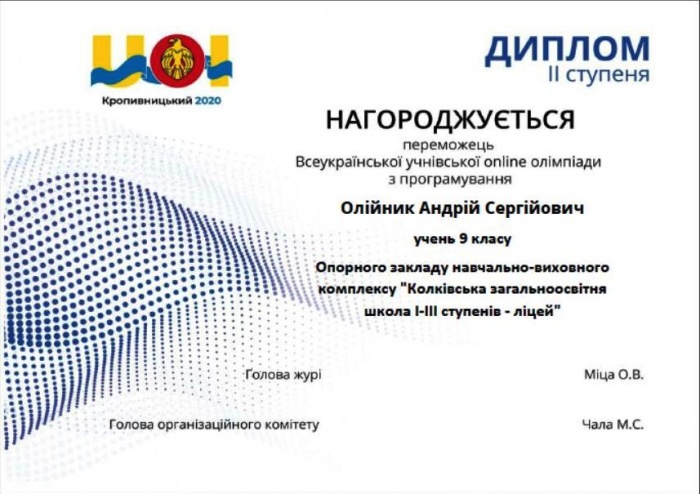 Вітаємо учня 9 класу Олійника Андрія, який отримав диплом ІІ ступеня та є кандидатом у збірну України на Європейську олімпіаду з інформатики серед юніорів 2020. Бажаємо нових перемог!