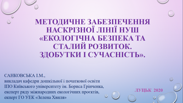 Санковська Ірина Мечиславівна, викладач кафедри дошкільної і початкової освіти Інституту післядипломної освіти Київського університету імені Бориса Грінченка, експерт ряду міжнародних екологічних проєктів, ГО Український екологічний клуб «Зелена Хвиля»;