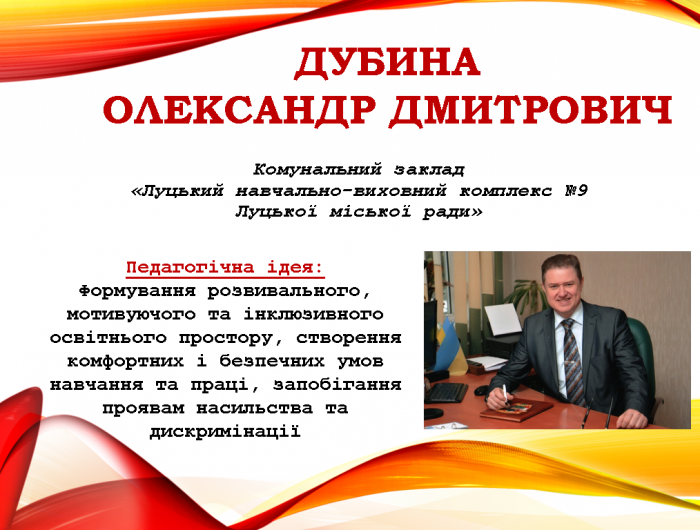 Переможцем у номінації став Дубина Олександр Дмитрович, директор Комунального закладу «Луцький навчально-виховний комплекс № 9 Луцької міської ради».