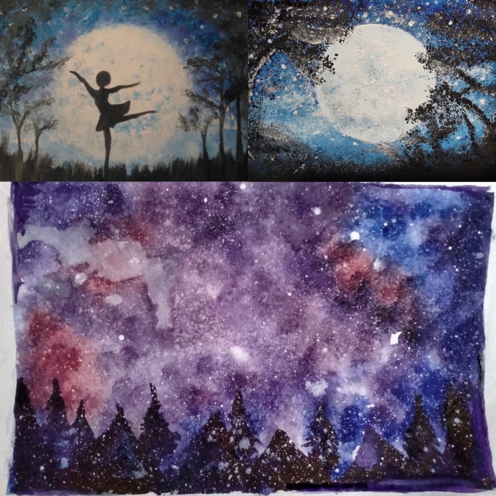 - пуантилізм»; акварель по вологому; акварель по вологому з додаванням солі; гуаш та фольга (кер. Ричко В. К.);