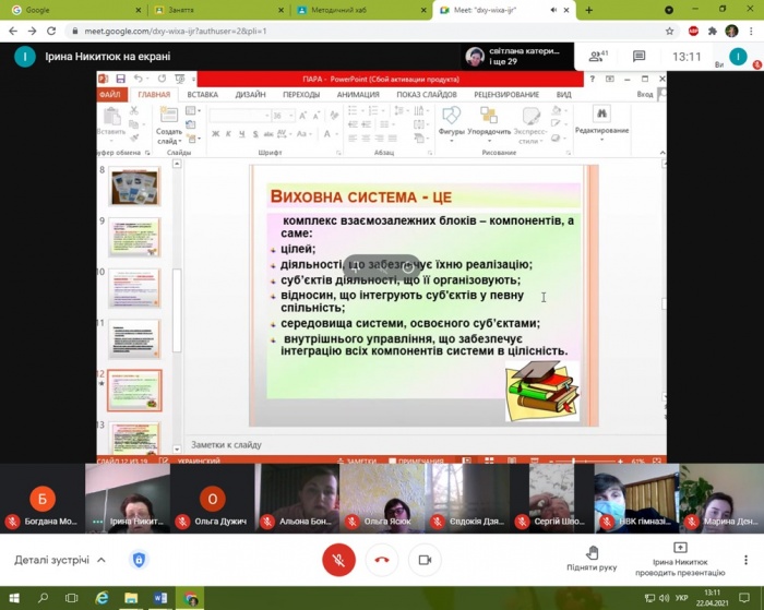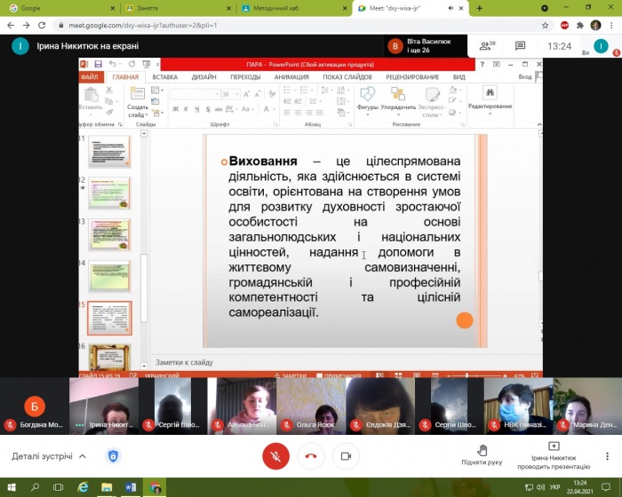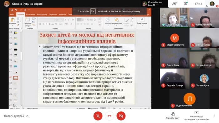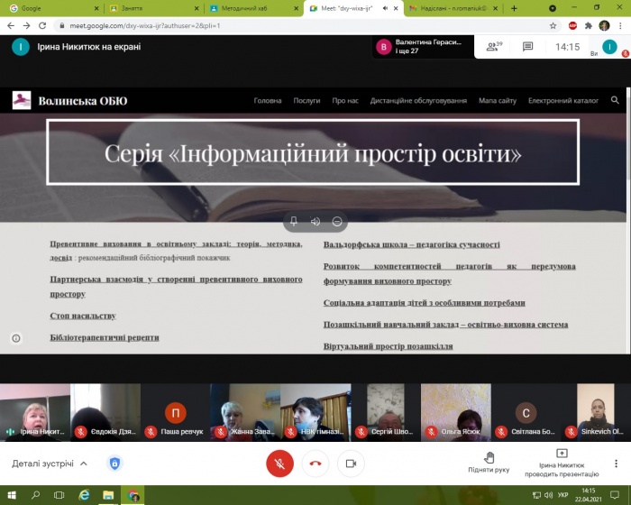 Педагоги взяли участь у дискусії «Виховна діяльність у сучасному закладі загальної середньої освіти: аналіз проблем, тенденцій і перспектив». Вони утвердились у думці, що процес виховання є наскрізним, формує цінності, дає змогу набути компетентності для життя. Наголошено на можливості самоосвіти як важливому компоненті науково-методичного забезпечення розвитку компетентностей педагогів. Учасників семінару зорієнтовано на співпрацю з Волинською обласною бібліотекою для юнацтва. З цією метою відбулася презентація бібліографічного посібника педагогічного спрямування «Превентивне виховання в освітньому закладі: теорія, методика, досвід» у рамках серії «Інформаційний простір освіти», [уклад.: Н. А. Ількевич, І. В. Никитюк]. — Луцьк : [б. в.], 2021. — 20 с., у якому представлено електронні копії правових джерел, наукових досліджень, методичних рекомендацій та публікацій з досвіду роботи з питань превентивного виховання, розміщених у вільному сегменті інтернету. Режим доступу: https://drive.google.com/file/d/19kfV8bnVINNuxIpBTFnyxgIcfIPoipGEview