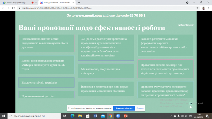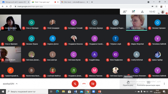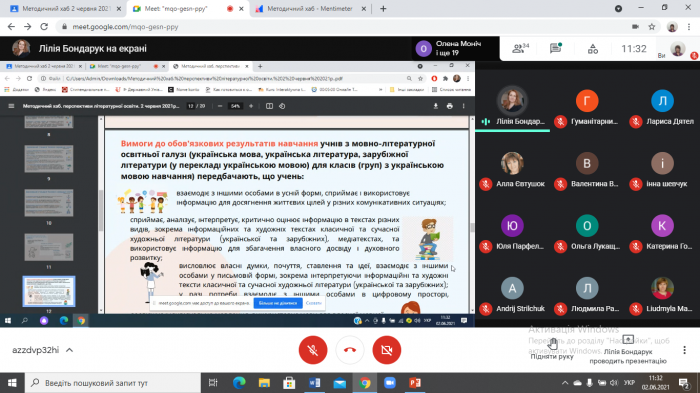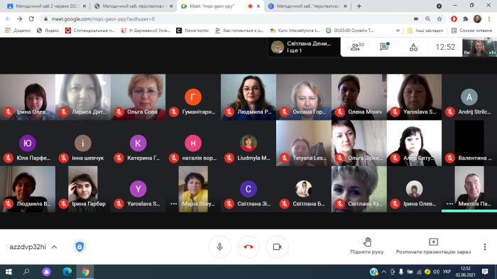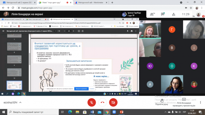 Методист відділу Олевська Ірина Ігорівна, яка є також учасником проєкту з підготовки педагогів до впровадження НУШ, зосередила увагу присутніх на підсумках 2020/2021 навчального року та наголосила на важливості вироблення рекомендацій, завдань щодо викладання дисциплін гуманітарної та історичної галузі у 2021/2022 навчальному році.