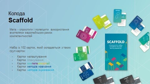 Scaffold - це інструмент, що складається з 102 карток, створений Європейським фондом освіти та Об’єднаним дослідницьким центром Європейської комісії. Він допомагає покроково проєктувати освітній процес, інтегруючи ключові компетентності в навчання.