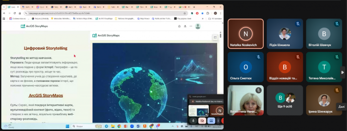 Керівник обласної авторської лабораторії Наталія Миколаївна Носкевич, учитель географії Маневицького ліцею № 2, поділилася досвідом інтеграції інструментів ГІС (ArcGIS StoryMaps, ArcGIS Online) у освітній процес.