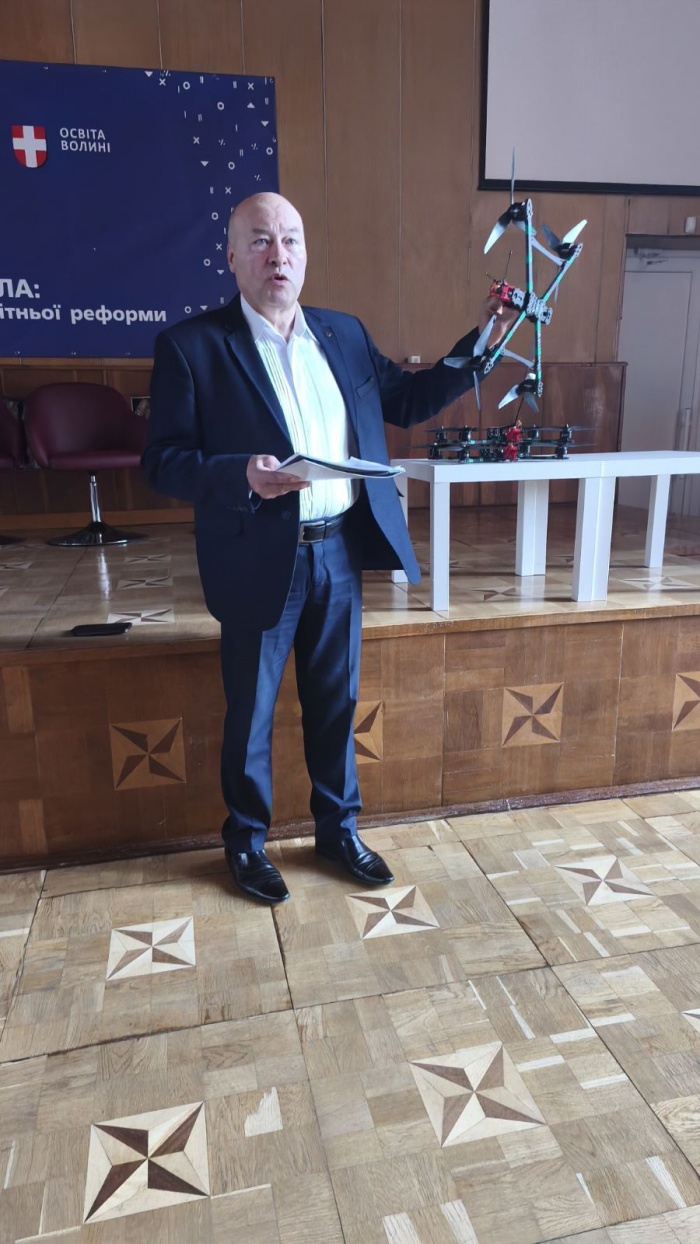 Петро Степанович коротко розповів про роботу Інституту та ГО «Світ освіти», котру очолює, про здобутки та напрями волонтерства. Завдяки спільним зусиллям ВІППО й освітянської спільноти області, активній підтримці та співпраці з В’ячеславом Володимировичем від початку повномасштабного вторгнення для потреб ЗСУ передано вже понад 60 автомобілів та тонни гуманітарних вантажів, останніх два роки реалізовується проєкт «Залізний птах» із виготовлення ФПВ-дронів (наразі близько двох сотень «пташок», придбаних завдяки активній підтримці освітян, полетіли на фронт нищити ворога).