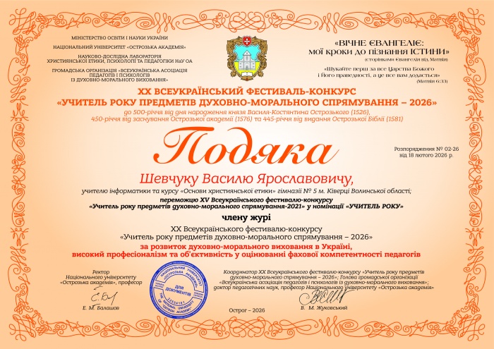 Подякою за розвиток духовно-морального виховання в Україні, високий професіоналізм та об’єктивність у оцінюванні фахової компетентності педагогів відзначено члена журі XX Всеукраїнського фестивалю-конкурсу «Учитель року предметів духовно-морального спрямування ‒ 2026» Шевчука Василя Ярославовича, учителя інформатики та курсу «Основи християнської етики» гімназії № 5 м. Ківерці Волинської області; переможця (І місце) XV Всеукраїнського фестивалю-конкурсу «Учитель року предметів духовно-морального спрямування ‒ 2021» у номінації «УЧИТЕЛЬ РОКУ».