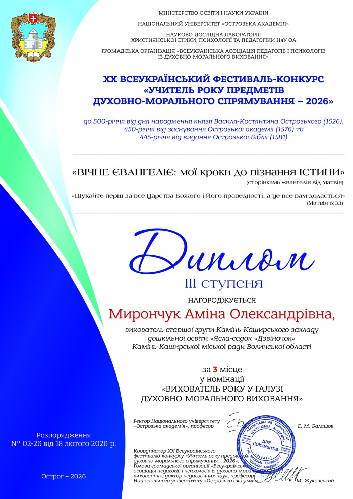 Вітаємо Мирончук Аміну Олександрівну, вихователя старшої групи Камінь-Каширського закладу дошкільної освіти «Ясла-садок «Дзвіночок» Камінь-Каширської міської ради Волинської області, за заняте ІІІ місце у номінації «ВИХОВАТЕЛЬ РОКУ У ГАЛУЗІ ДУХОВНО-МОРАЛЬНОГО ВИХОВАННЯ».