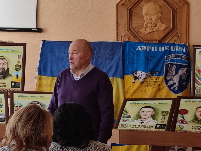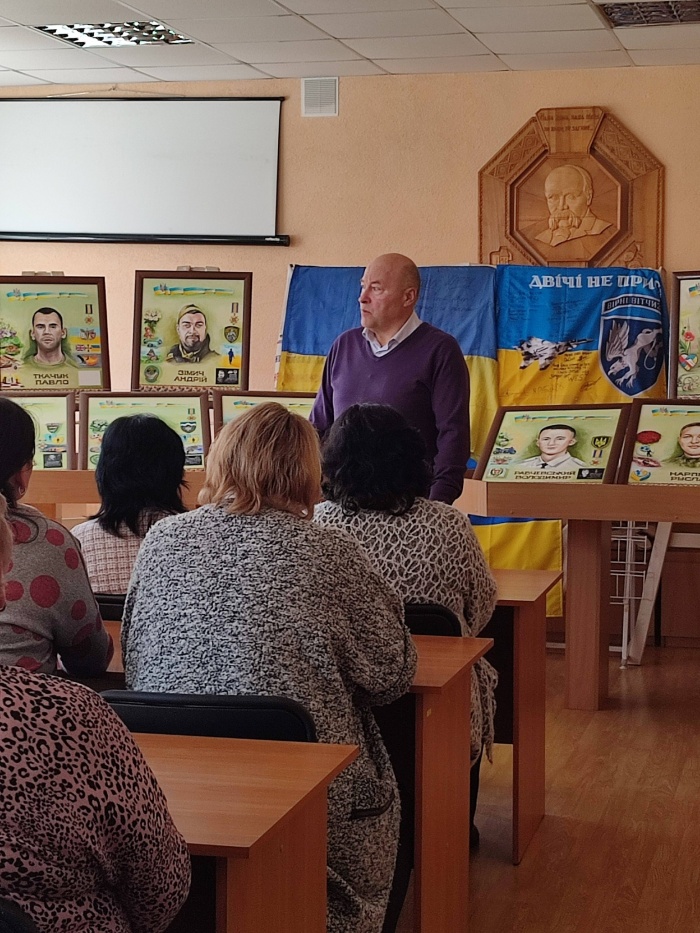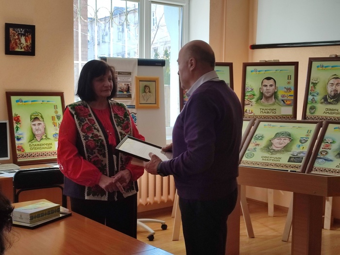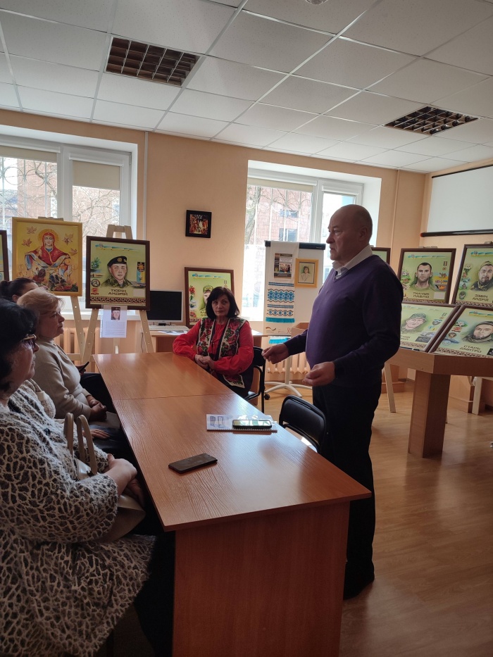 У рамках експонування меморіального виставкового проєкту «Пам’ять про Героїв житиме вічно!» відбулася зустріч-презентація із авторкою - художницею Торчинського історичного музею імені Григорія Гуртового Ніною Фесенко. Модератор зустрічі Петро Олешко, професор, кандидат історичних наук, директор Волинського ІППО, у вступному слові окреслив актуальні питання участі та внеску освітян у підтримку Збройних сил України та національно-патріотичне виховання учнівської молоді в складних умовах воєнного часу. Він наголосив, що важливим для закладів освіти області є досвід інституту як об’єднавчого центру по організації співпраці з військовими частинами, надання волонтерської допомоги, меморіалізації та вшанування загиблих Героїв, зокрема і педагогів волинських шкіл.