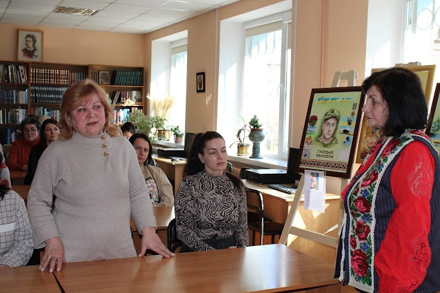 Ніна Фесенко поділилася власним досвідом документування біографічних даних та родинних спогадів про загиблих Героїв Торчинської громади, розробку концепції та створення 35 художніх портретів, які представлено на діючій виставці. Із присутніми на зустрічі працівниками інституту, вчителями образотворчого мистецтва відбулася зацікавлена розмова про активну участь та ініціативність кожного педагога у закладі освіти, територіальній громаді у відданні шани загиблим за незалежність України Героям та поширення сучасних практик меморіалізації і вшанування пам’яті полеглих земляків, зокрема, відкриття меморіальних дошок, створення музейних експозицій, перейменування вулиць, проведення патріотичних заходів тощо.